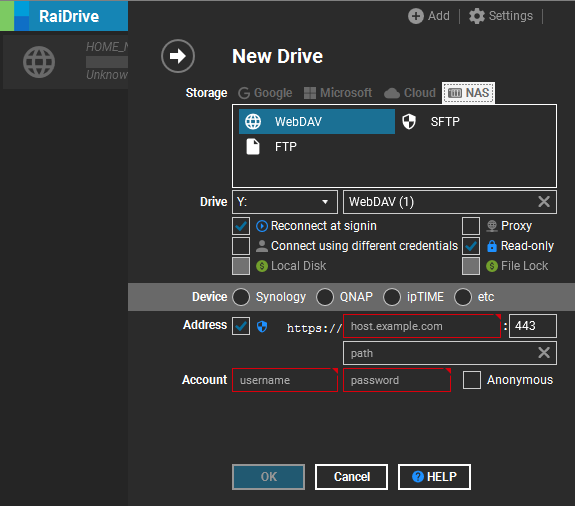 - Synology NAS에 연결할 경우 "Synology"를 선택해도 되지만 선택하지 않아도 크게 의미는 없습니다.